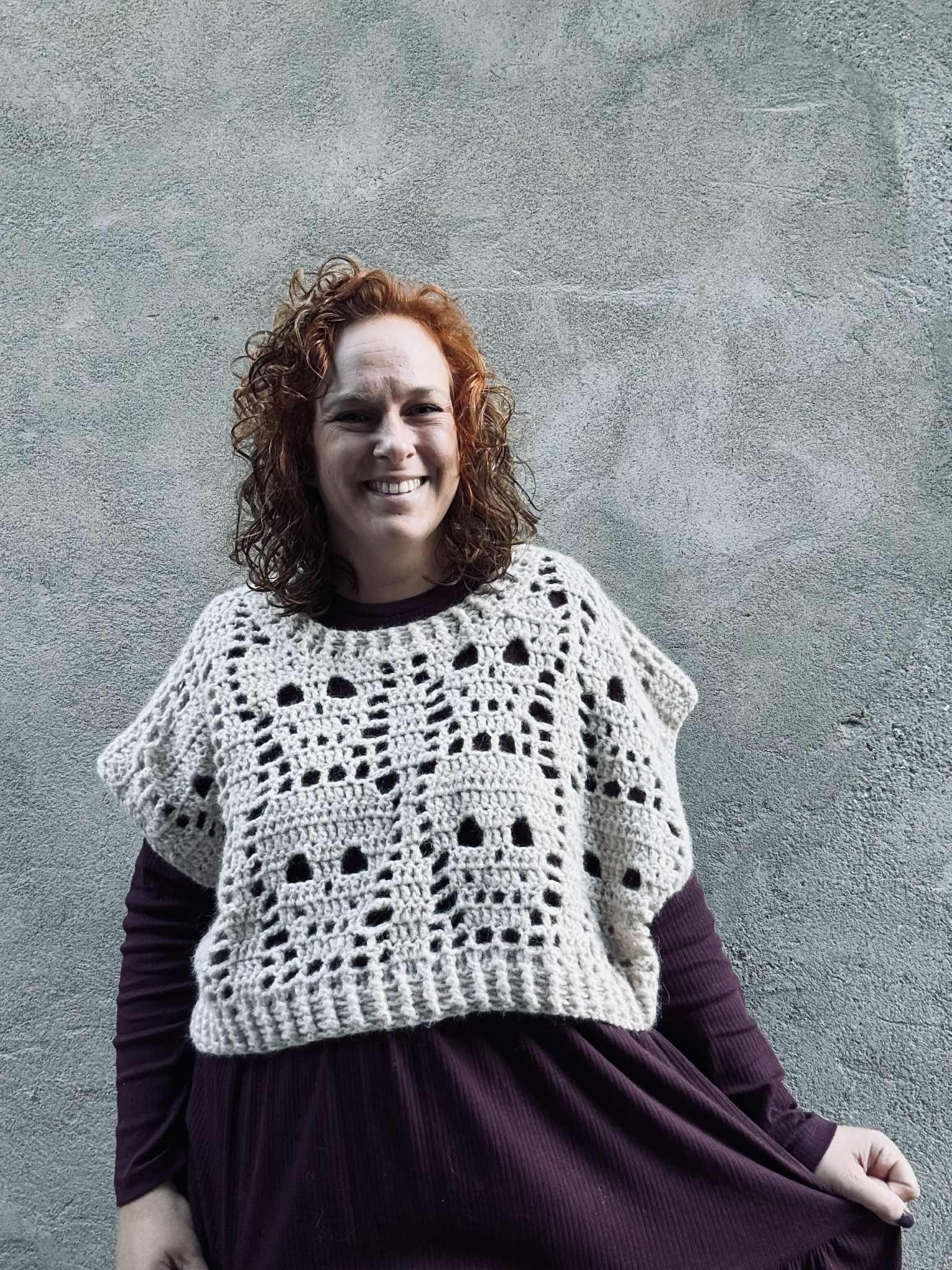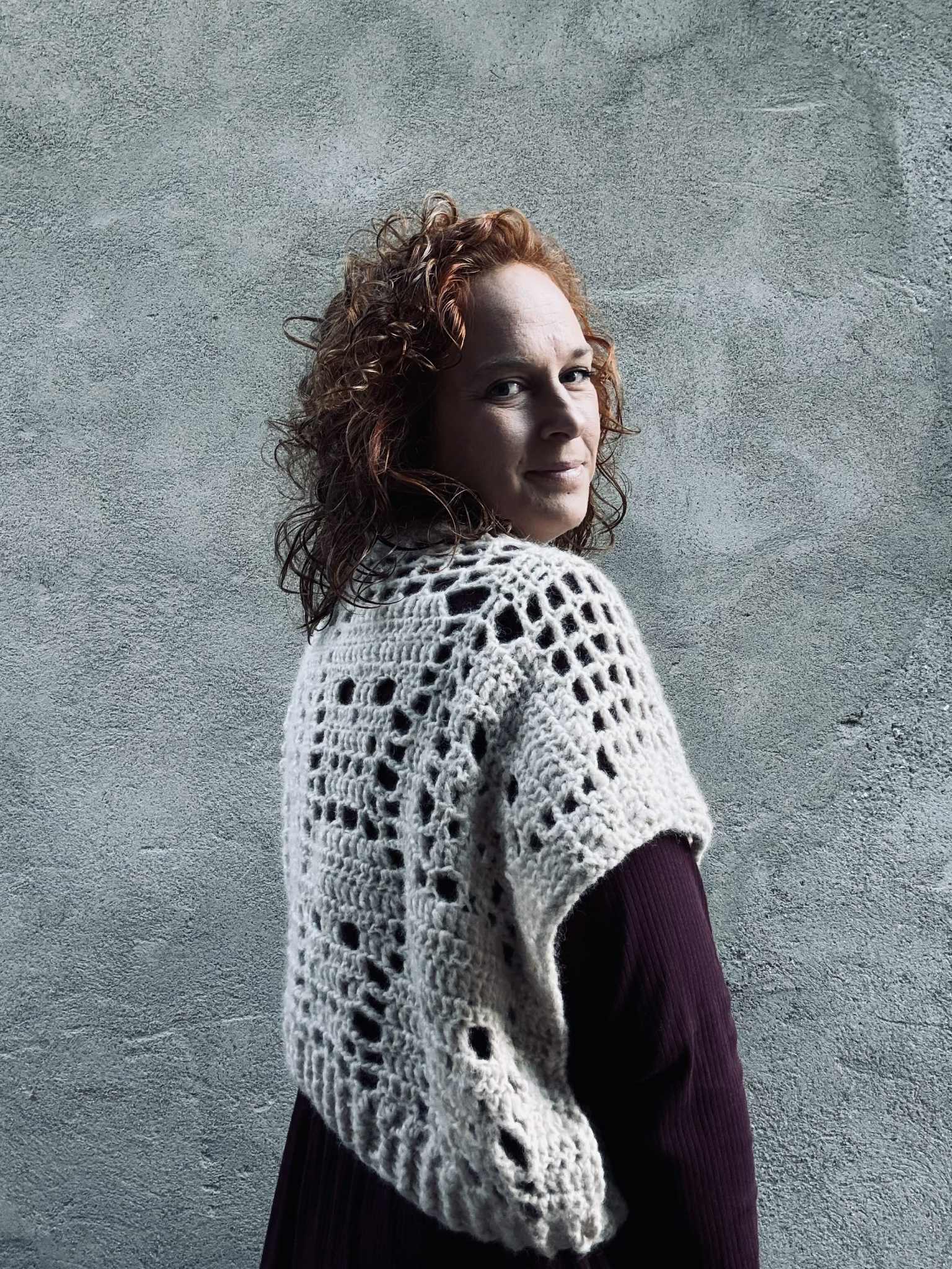 You’ll start at the bottom of the front panel, work your way up over the shoulders, and continue down the back. Neck shaping is done as part of the front panel, and the neckline ribbing is added afterward. Once both panels are complete, a bottom ribbing is worked, joining the front and back. The armholes are finished with a subtle, clean edge.