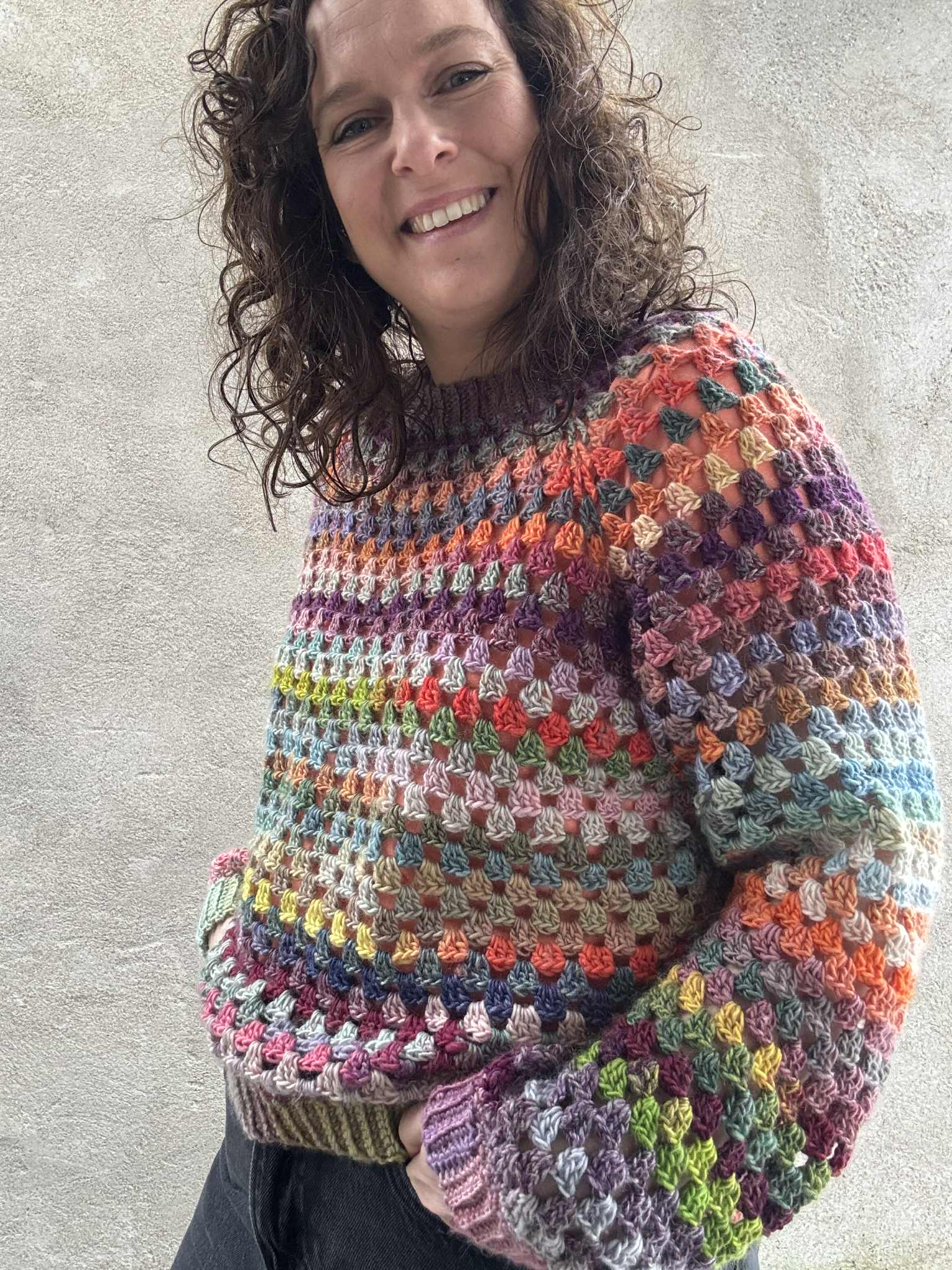 Valg af størrelse: Når du skal vælge en størrelse, skal du måle dig selv, og derefter se på målene i opskriften, og derfra finde den du ønsker. På billedet ses en størrelse 4 (113 cm), på en model med brystmål 96 cm.